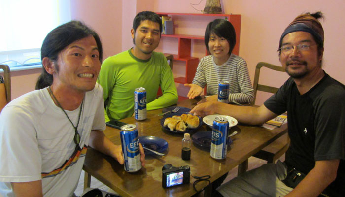 出来上がった焼きたてほやほやの餃子を目の前にして、トルコのビールエフェスで出会いに乾杯。この後は、動画談義で盛り上がりましたよ、って、いや、ユウジくんと話しながら、実は、オイラ、動画自体のネタはそんなに盛り上がれるほど、話を持っていないということに気づかされまして。動画の話をするつもりが、いつの間にか動画で扱っている旅の内容の話になってしまう。結局旅話で、盛り上がる。チャリダー談義、話が尽きることがありません、ハイ。