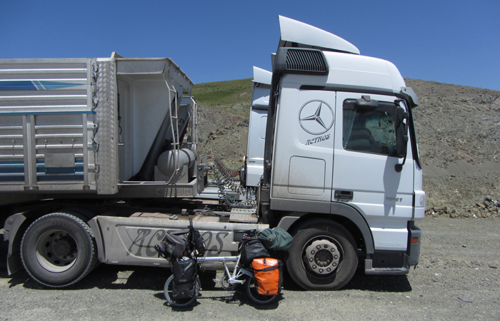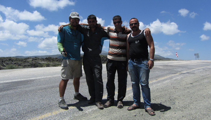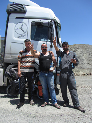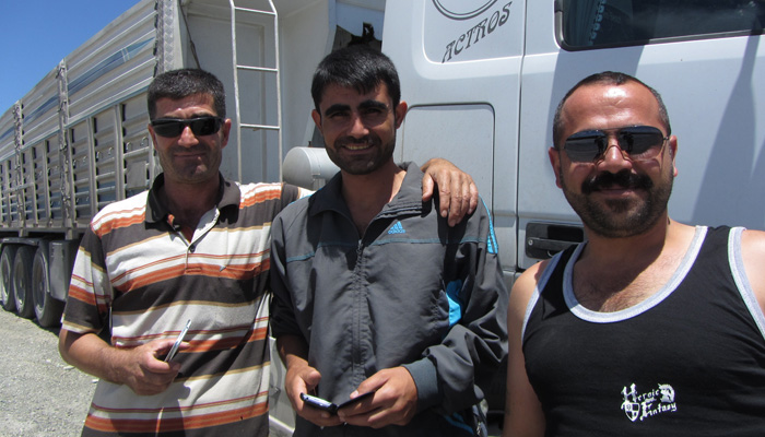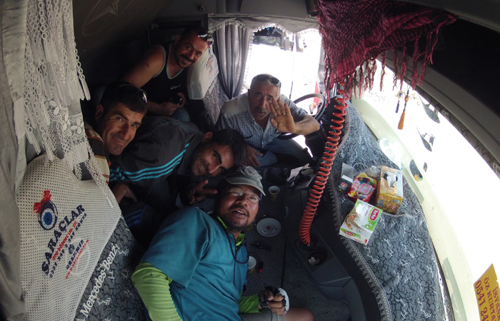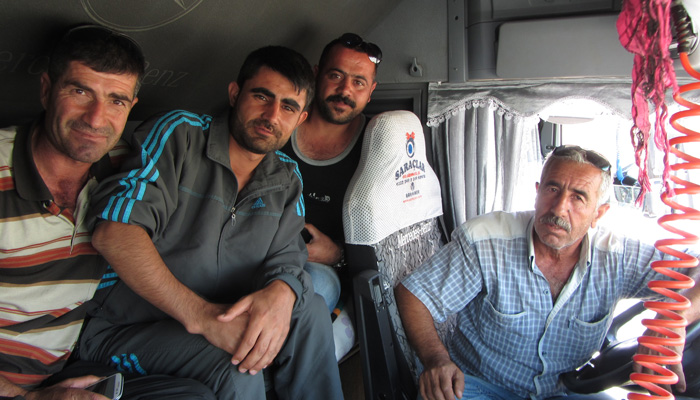 その後、ちょっと小高い丘になっている坂道があり、そこをヒイコラと登った所に、数台のトラックが止まっていた。「チャイでも飲んでけ」といって、車内に招いてもらったのだが、いろいろ話してみたら、このおじさんたち、クルド人とのこと。「先ほど、クルド人の人からこんな仕打ちをうけて」と突然木で叩かれた話をしたら、「すまん」とおじさんたちに謝られた。いろいろ大変なんだよ、とは言いながらも、前向きに生きているおじさんたち。哀愁あるメロディーの歌を歌ってくれ、「これがクルド人の気持ちだ」と。確かに、なんか伝わってきました、ハイ。