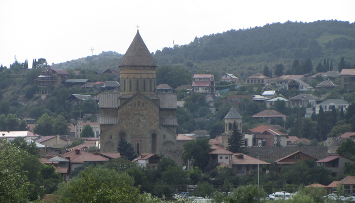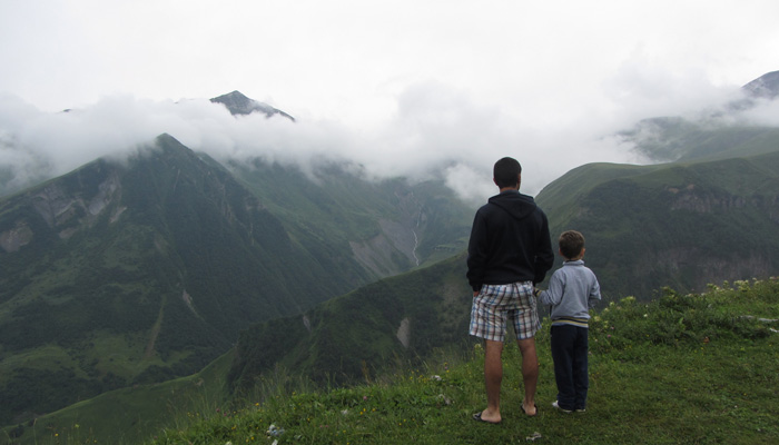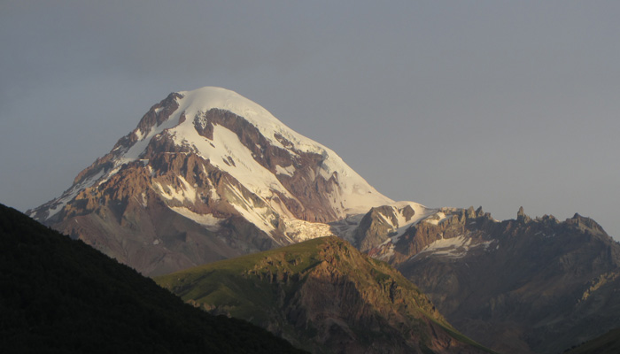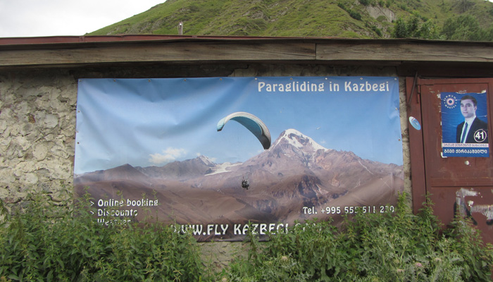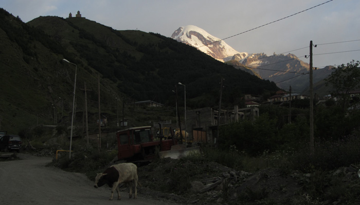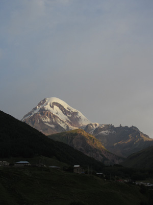 朝起きて窓から外を見たら、空から雲が完全に消えていてビックリ。慌てて外へ出てみたら、昨日はまったく見えなかったカズベキ山がクッキリ見えるじゃないですか。おお~、これこれ、これを見たかったんですよ~、と感激。早速、近くから見てみようと、昨日登った丘にもう一度登りに行ったんですが・・・途中の見晴台で見たところ、もう、雲がモクモクと漂ってきていて、またカズベキ山は雲隠れしてしまっていた。う~ん、まぁ、町からいい感じで見れたからいいか。