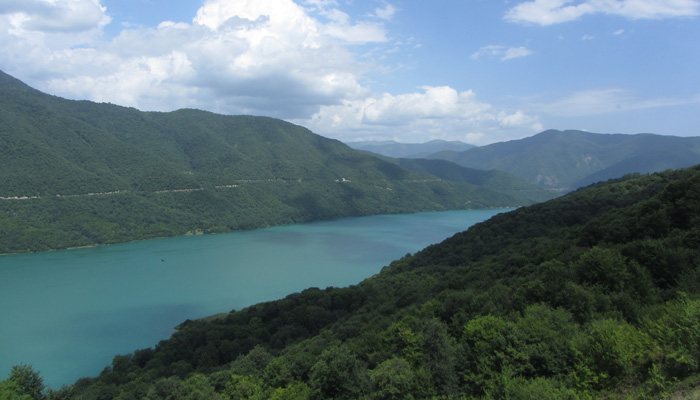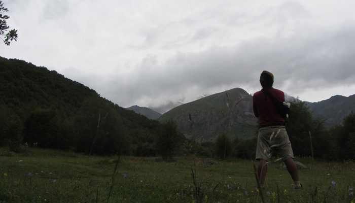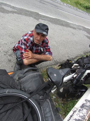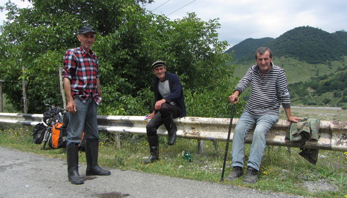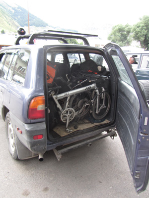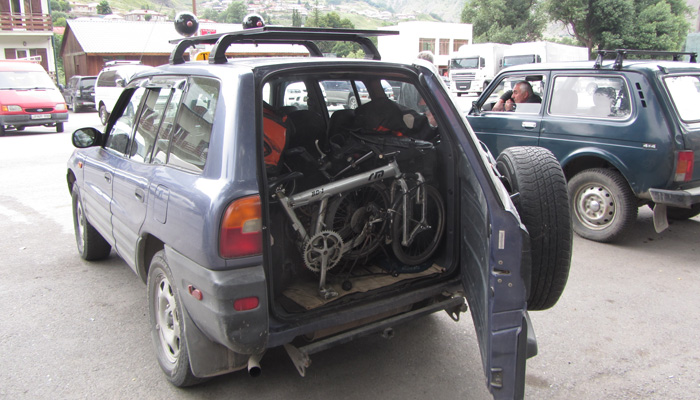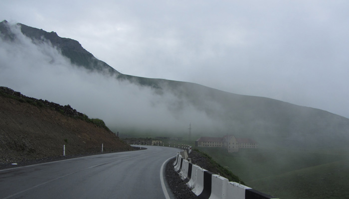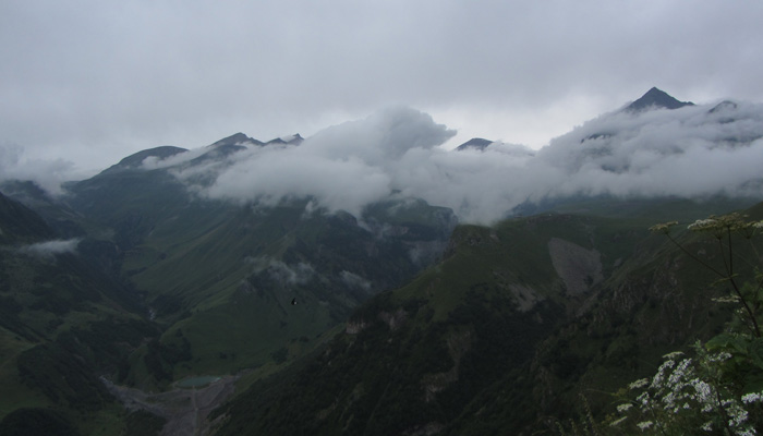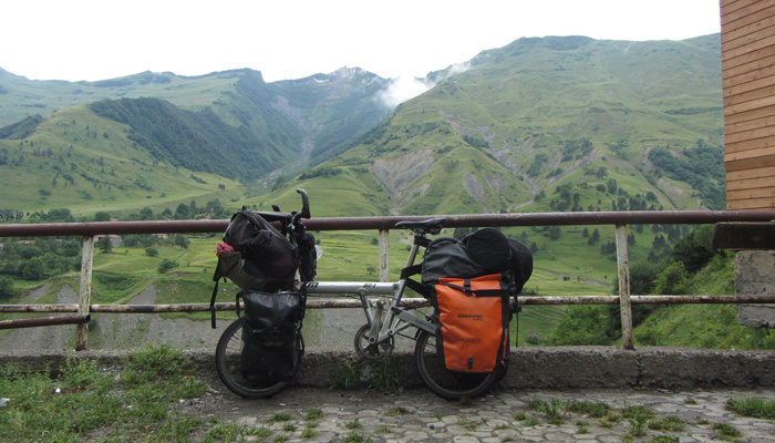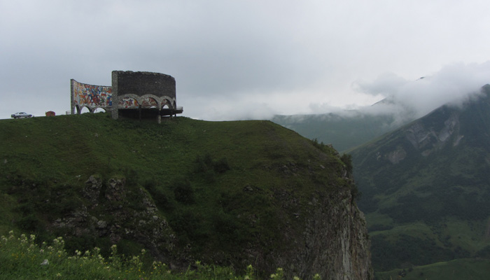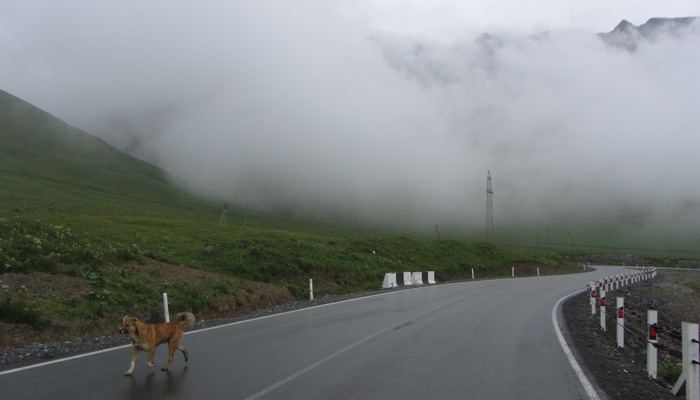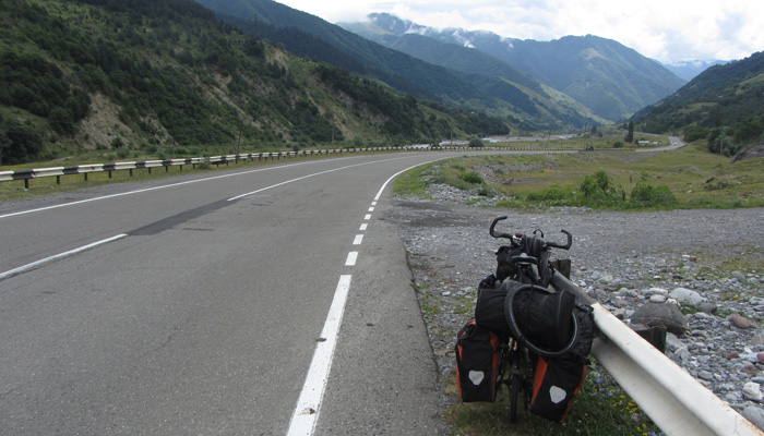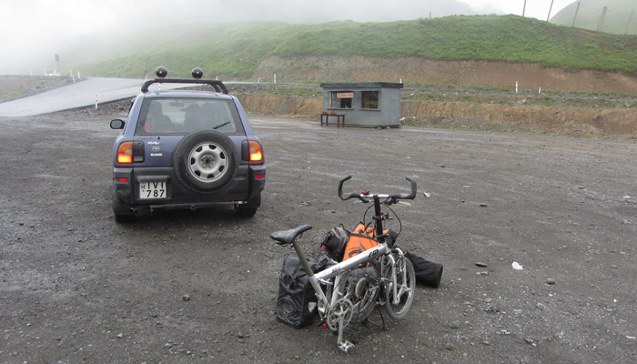 とりあえず、目的であったカズベキ山が見れたので、大満足。またグルジア軍道を通ってトビリシに戻ることに。風光明媚なグルジア軍道なので、チャリで走って、また景色を堪能しながら・・・と思っていたのだが、一気に空が雲で覆われて、天気がイマイチ。しかも、一度走った道、しばらく上り坂が続くのが分かっているので、チャリで走っていく気が失せてしまい・・・上り坂の上まで、車に乗って行くことに。