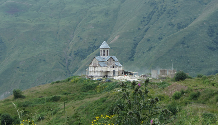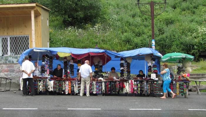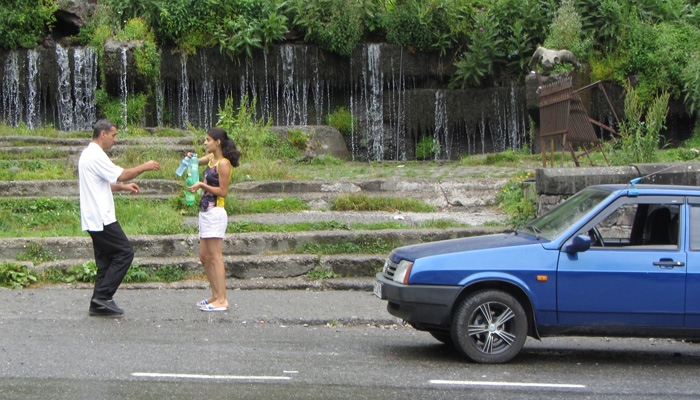 タクシーを個人チャーターしようとしたところ、ちょうど、カズベキに向かうというドイツ人の3人組がいたので、オイラは途中までってことで、彼らが乗る車に同乗させてもらうことに。