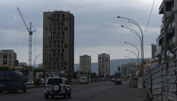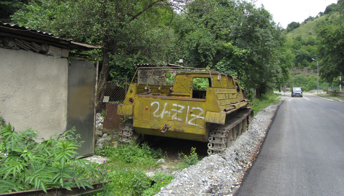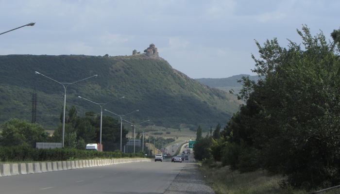 さて、上り坂の上まで来たら、ポツポツと雨が降り始めた。このままトビリシまで乗せてもらっていっちゃおうか、とも思ったのだが、ここからは緩やかな下り坂だし。少々の雨ならば、まぁ、大丈夫か、ということで、予定通りタクシーを降りて、自転車で走っていくことに。