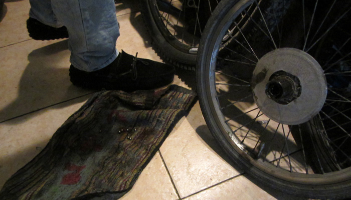 お目当ての整備セットはすぐに見つかった。で、ついでに、エジプト走行中から気になっていたハブの不具合を直してもらうことに。一応ハブを分解して、中のベアリングを交換してもらったりして、直したのだが、一番重いギアを使う際に、チェーンがかみ合わなくなるという現象は直らず。まぁ、これは、ハブの問題ではなく、ギアの歯が摩耗してしまったことが原因だと思われる。とりあえず、ハブがなんとかなったから、まぁ、いいか。