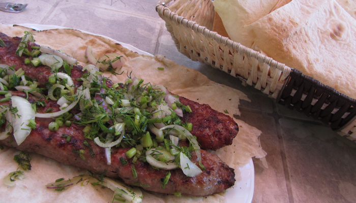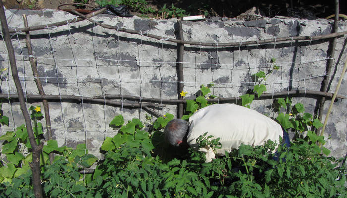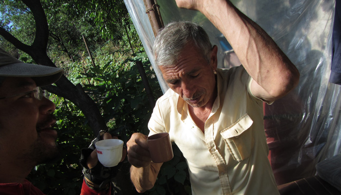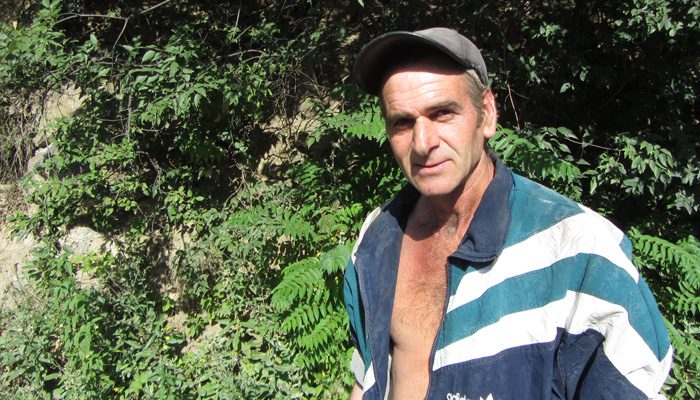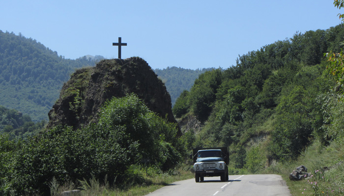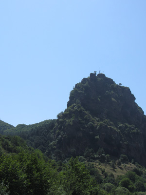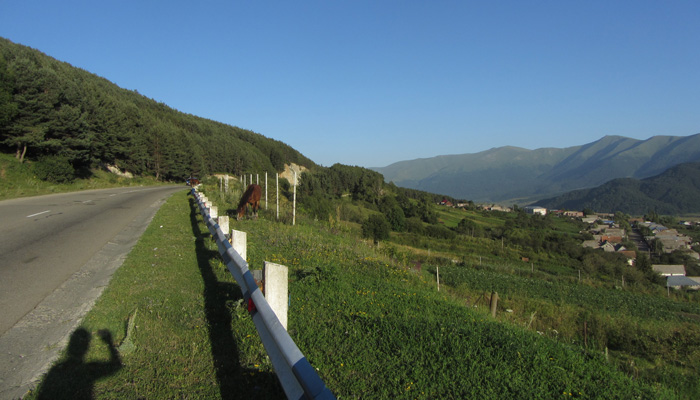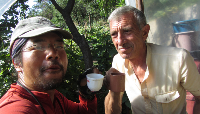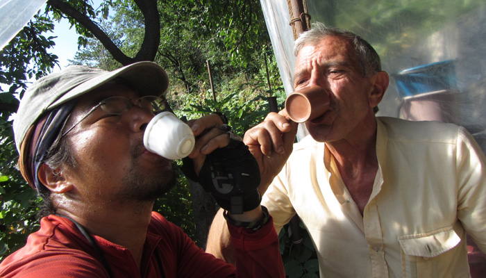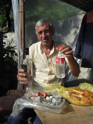 道脇の菜園で野菜や果物を作っているじいさんだった。パンやソーセージとともに、採れたてのきゅうりやラズベリーなどを出してくれまして。と、そして、コーラのボトルに入った透明なものも取り出してきた。明らかに入っているものはコーラじゃない。あ~、これは、と思ったら、案の定、蒸留酒チチャだった。いや、オイラはこれからまだまだ走らなきゃいけないから、酒を飲んで酔っ払っている場合じゃないんですよ、と言ったのだが、言葉が全然通じず、結局飲まされることに。いやぁ、ホント、グルジアといい、アルメニアといい、お酒が好きな人たちだな。朝っぱらから飲むっていうことに、全く抵抗がないこの国民性。