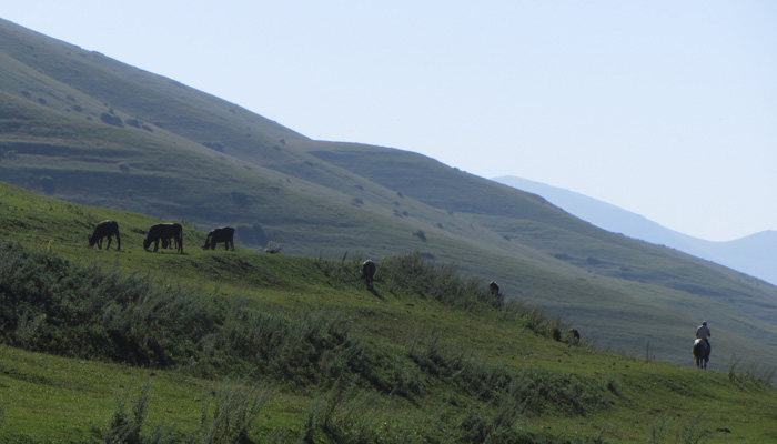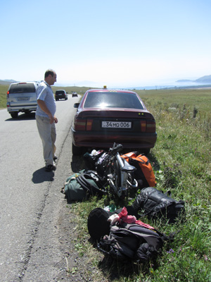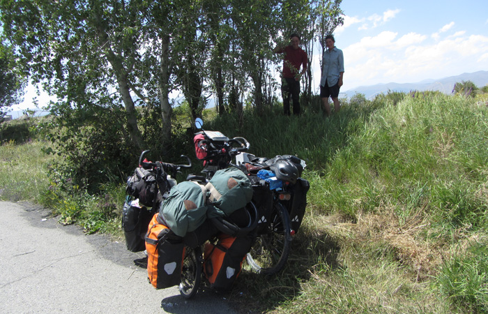 ザリガニ料理を満喫した後、ひた走り。先ほどの山頂が高さのピークだったので、今日の走りはそんなに大変ではない。と、途中で、フランス人チャリダーカップル、ヨゴス&ベルジニに遭遇。爽やかなそよ風が吹く中、一緒に道端で休憩。走るスピードが違うから、走り始めたらオイラはあっという間に置いていかれちゃったけど・・・彼らとは、イランでまた再会することになる。