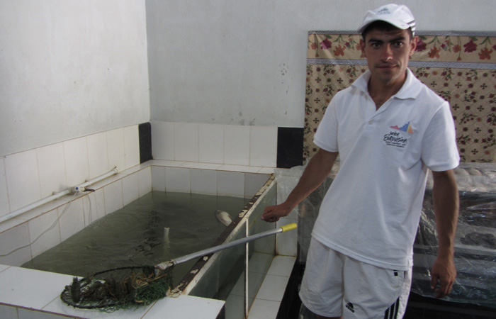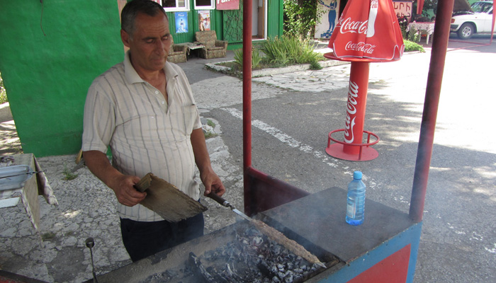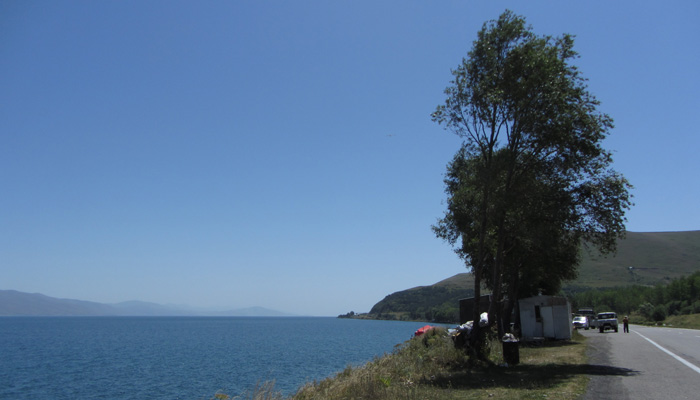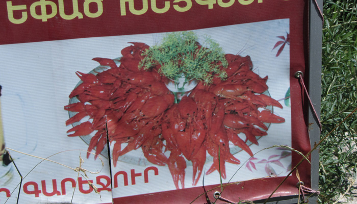 さて、湖沿いを走っていたら、ザリガニ料理の看板が見えた。そう、ここアルメニアではザリガニ料理が有名なんですよ。ぜひともザリガニ料理を食っておかねばと思っていたオイラ、お店に入って食べてみることに。
