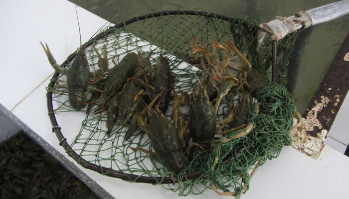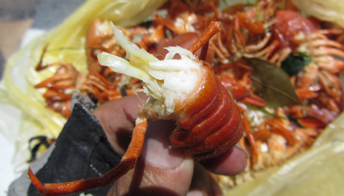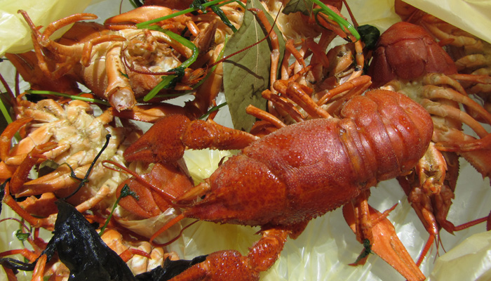 イケスのようなものがあって、そこに生きたザリガニがいた。それを網ですくってくれて、その場で茹で上げてくれるらしい。最初は黒っぽかったザリガニが、真っ赤になって出てきた。食べてみると、全然泥臭いことはなく、エビに似て、プリプリして美味しい。