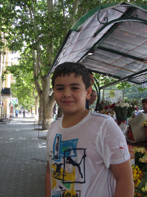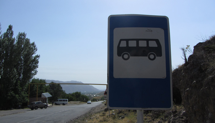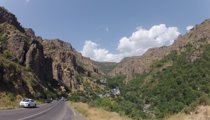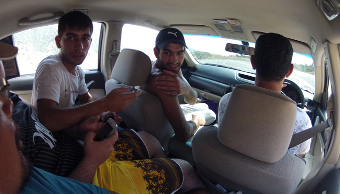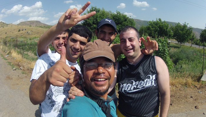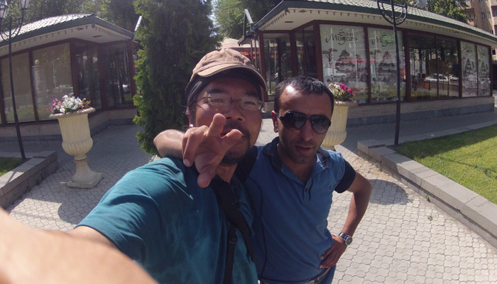 さて、ゲガルド修道院は山の上にあって、行くときは乗り合いバスに乗って行けたのだが、帰りはバスが捕まらず、しばらく歩いていくことに。と、その時、同じく教会帰りの若者たちが乗った車がやってきて、なんとオイラを乗せていってくれるとのこと。