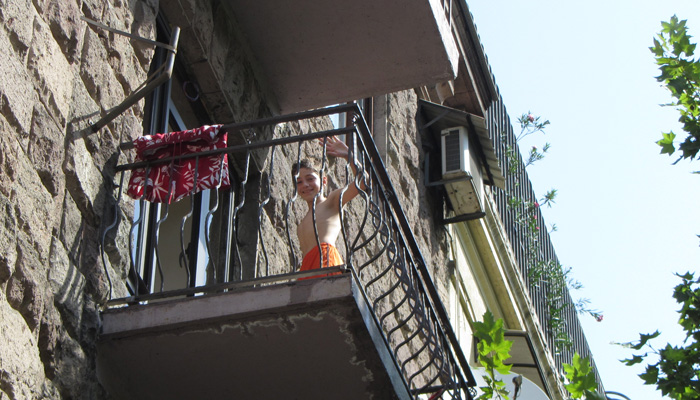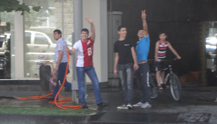 と、その意味は、外に出たらすぐ判明した。外に出たら、目の前を歩いていた少年がいきなり水まみれになったのだ。何事!?と思って上を見ると、3階のバルコニーからバケツで水をぶっかけた少年の姿が。