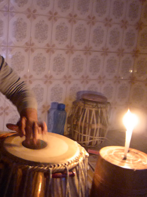 11時からタブラレッスン。なのに、部屋の電気がつかないじゃないですか。まぁ、停電はよくあることなのだが・・・今日は珍しく停電用の予備バッテリーも切れてしまうほどの停電だった。真っ暗な中、ロウソクの火をともしてレッスンが始まる。ロマンチックではある。